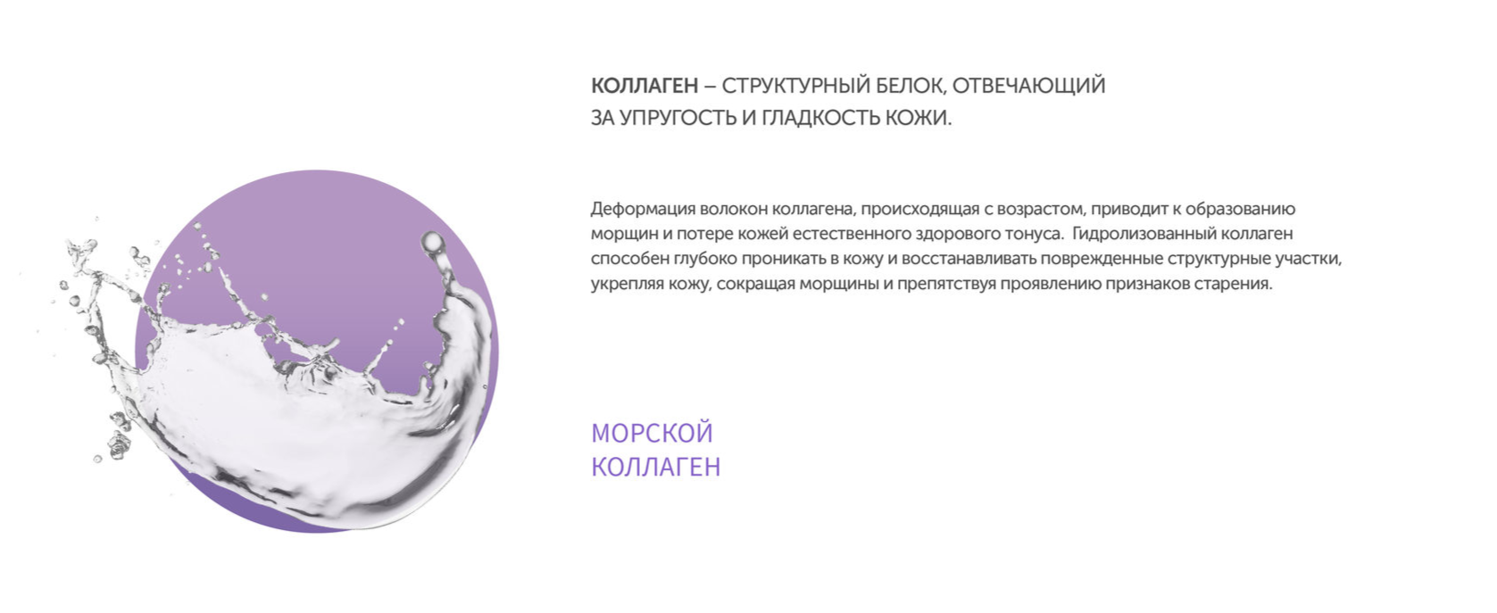 Collagen fibers' deformation, coming with age, leads to wrinkles formation and sagging. Hydrolyzed collagen is able to penetrate into deep skin layers and restore its structure, firming the skin, reducing fine lines and wrinkles and preventing signs of ageing developing.