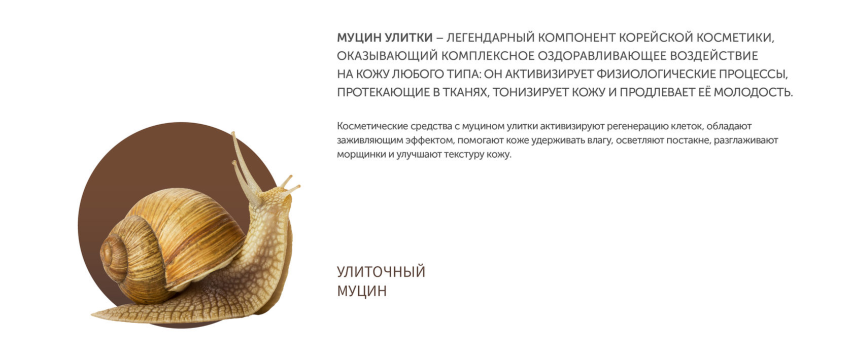 SNAIL MUCUS IS A LEGENDARY K-BEAUTY COMPONENT, PROVIDING COMPLEX BENEFICIAL IMPACT ON SKIN OF ANY TYPE: IT ACTIVATES ALL SKIN METABOLIC PROCESSES, TONES UP SKIN AND PREVENTS SIGNS OF AGEING APPEARING.